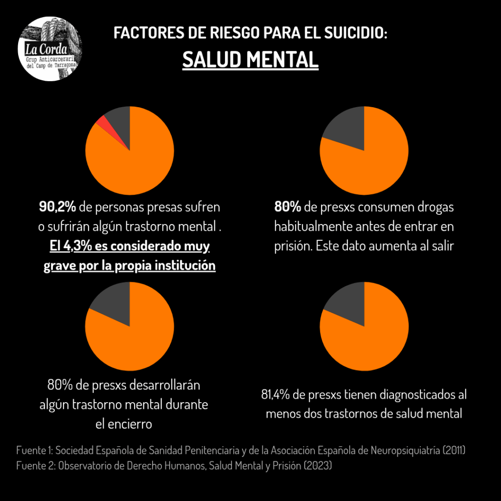 Hemos estado unas semanas recogiendo datos, informaciones y elaborando diapositivas sobre la salud mental, el suicidio y las contenciones mecánicas en las prisiones. Compartimos aquí las primeras. Esperamos que las encontréis interesantes, y que os enfaden y os preocupen igual que a nosotrxs.
