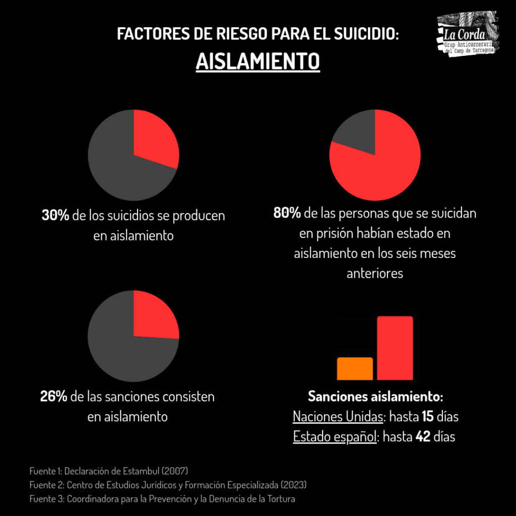 Un d’ells és l’aïllament, on les persones passen fins a 22 hores al dia tancades en una cel·la. A Catalunya els mòduls d’aïllament s’anomenen DERT (Departament Especial de Règim Tancat). La taxa de suïcidis en aquests espais és 3 vegades més alta que en la resta de mòduls, i 12 vegades més alta que fora de la presó.