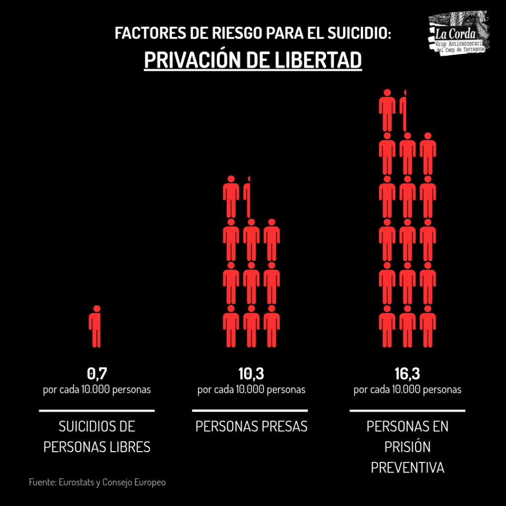 Però hi ha un col·lectiu altament afectat per les autolesions i els suïcidis. Un col·lectiu que no genera interès ni preocupació, i que rarament s’anomena en les ponències i materials sobre el suïcidi. Ens referim a les persones preses. Cada setmana moren persones darrere els murs; en molts casos per suïcidi. A més de la tortura que ja és en si mateixa la presó, hi ha certs factors que fan augmentar exponencialment el risc de suïcidi.