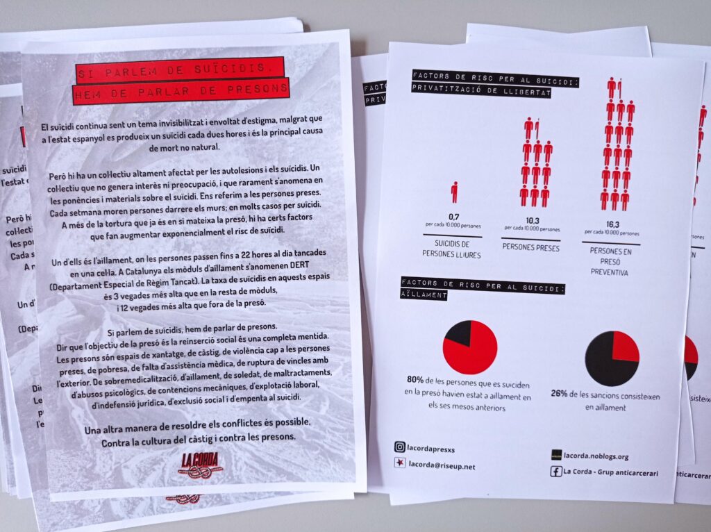 A l’acabar la xerrada, vam estar repartint octavetes informatives a les persones assistents i parlant amb alguna d’elles. Perquè si parlem de suïcidis, hem de parlar de presons!